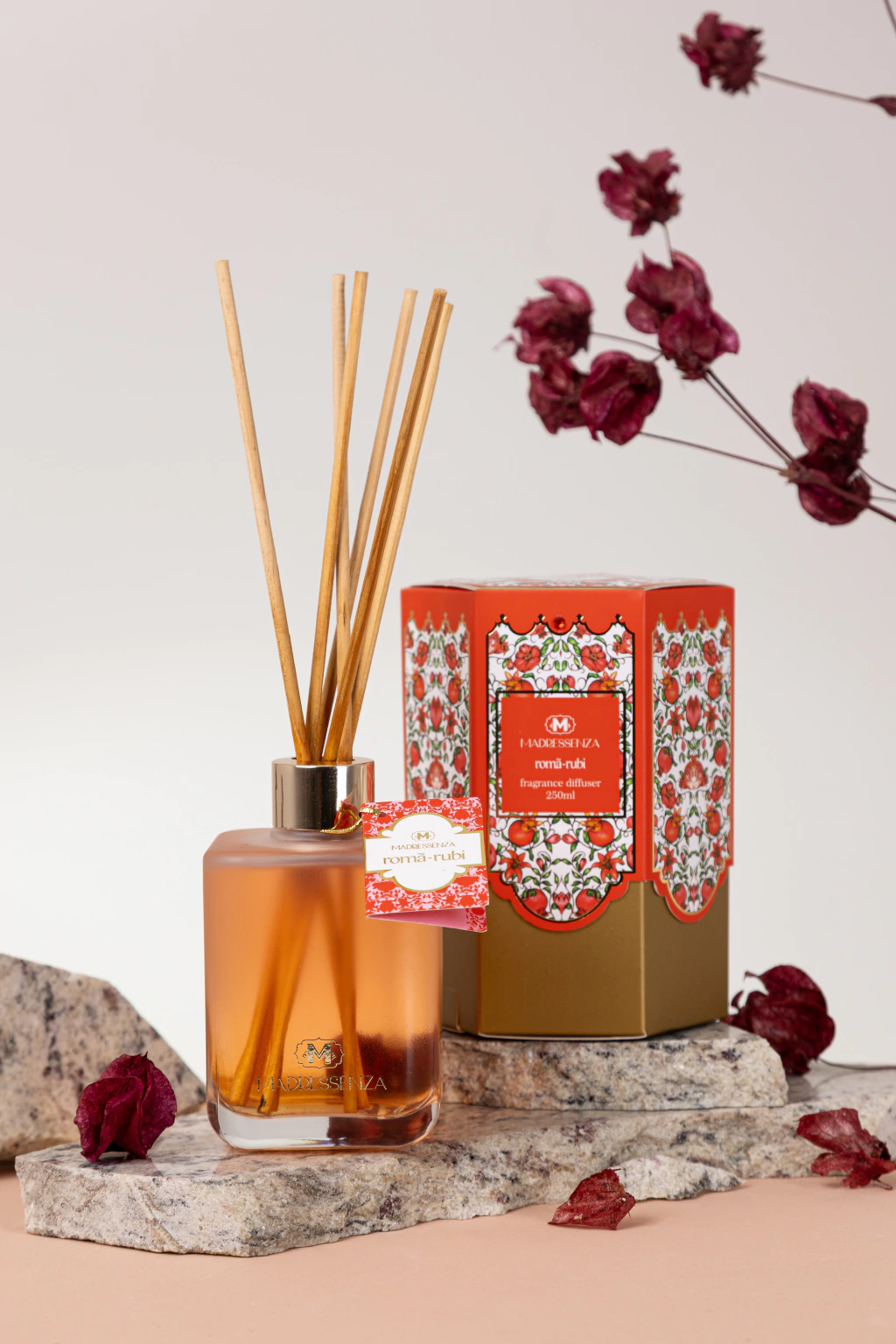 O aroma doce e envolvente de Romã-rubi relembra as mais intensas paixões, sua composição contém uma grande quantidade de óleo de essência, proporcionando uma longa duração ao seu difusor. Ideal para ambientes grandes.
